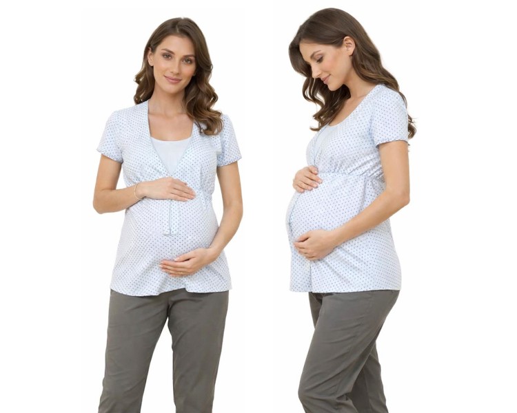 Piżama wykonana z miękkiej i delikatnej 100% bawełny powstała z myślą o kobietach karmiących, jak również o kobietach w ciąży. Góra została tak zaprojekowana, aby ułatwić karmienie. Z przodu znajdują się ukryte, wygodne wloty do karmienia oraz ozdobna kokardka. Wiązanie pod biustem pozwoli na regulowanie szerokości i dopasowanie do zmieniających się kształtów brzuszka. Spodnie z wąską gumą w tunelu. Model ten zapewni Ci wygodę oraz piękny wygląd.